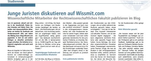 Jura ist spannend, aktuell und mitten in der Gesellschaft finden Andrej Umansky und Fabian Stam. Die beiden sind wissenschaftlichen Mitarbeiter am Institut für Strafrecht und Strafprozessrecht (ISS) haben das Weblog Wissmit.com gegründet, in dem sie und andere Kollegen zu aktuellen juristischen Fragen schreiben. Die private Initiative ist erfolgreich angelaufen und sucht noch Mitstreiter.